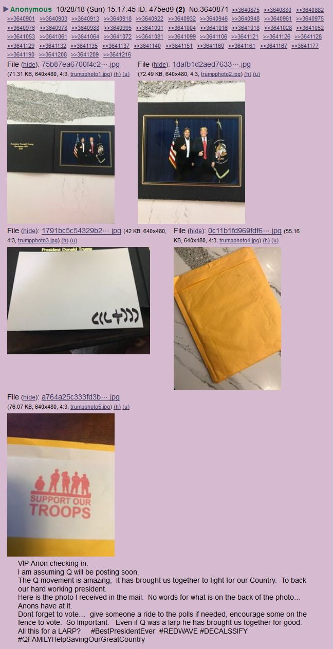 Der durchaus gut begründeten Annahme folgend, dass die “Q“-Gruppe aus dem unmittelbaren Umfeld des US-Präsidenten heraus handelt, ist es keineswegs abwegig weiter anzunehmen, dass der Präsident sich auf 8chan gelegentlich persönlich zu Wort meldet. Überhaupt, warum sollte Donald Trump, anstatt einer normalen Widmung mit seinem Namen, die Rückseite des Fotos mit “(((+)))“ signieren?